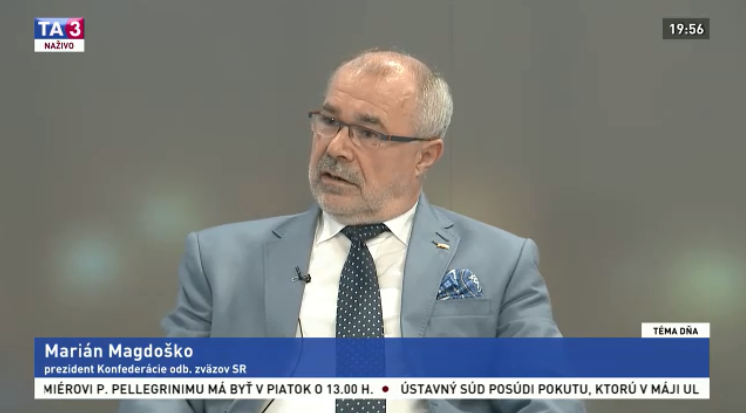 Marián Magdoško: „Ja budem kolegom trošku oponovať. Myslím si, že nemôžeme hovoriť o tom, že je tu už ekonomická kríza a ani žiadny ekonomický analytik to nepotvrdil a poviem čísla zo včerajška. Je pravda, že v júni nám produkcia klesala, zvyčajne to býva každý rok. Sú aj odstávky fabrík a je letné obdobie, celozávodné dovolenky. Ale v júli produkcia v priemysle išla opäť hore, opäť stúpla. Dokonca sú pozitívne čísla, ktoré uverejnil dnes štatistický úrad Nemecka, že aj nemecká ekonomika zázračným spôsobom v júli rástla. Po dlhej dobe. Takže áno, je tu nejaké spomalenie, evidujeme spomalenie, ale myslím si, že nie je to ešte v takom stave, aby museli byť rušené pracovné miesta v takej miere, aby to ohrozilo zamestnanosť. Je treba povedať, že zamestnávame na Slovensku dosť veľa cudzincov. Zamestnávame agentúrnych zamestnancov. Čiže ja nepredpokladám, že zatiaľ sú pracovné miesta našich zamestnancov ohrozené.“