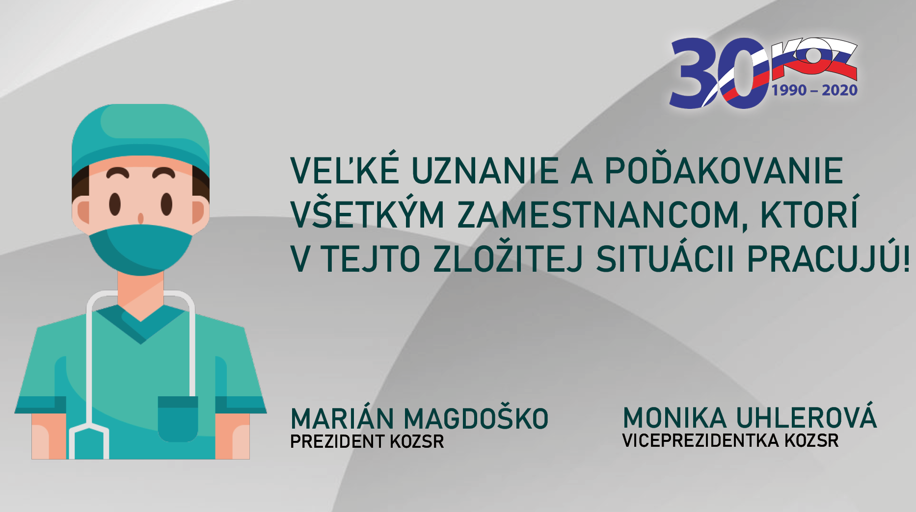 KOZ SR vyslovuje veľké uznanie všetkým zamestnancom v Slovenskej republike, ktorí pracujú a významne sa podieľajú na tom, aby sa v tejto pre nás mimoriadnej situácii, chod SR nezastavil. Nie je možné vymenovať všetky profesie, či už sú to zdravotníci, hasiči, policajti, vojaci, záchranári, vodiči vo verejnej aj nákladnej doprave, na železnici, v energetike, zamestnancov v nepretržitých prevádzkach, zabezpečujúcich potraviny, vodu, teplo, ale aj televízne, rozhlasové, aby sme mali informácie, a ďalšie a ďalšie profesie. Títo všetci majú naše veľké uznanie!