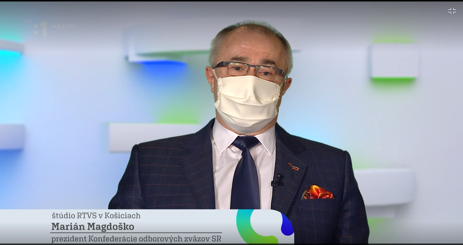 V relácii RTVS O 5 minút dvanásť (29.3.2020) spolu s ministrom financií Eduardom Hegerom, exministrom financií Ladislavom Kamenickým, viceprezidentom AZZZ SR Rastislavom Machunkom diskutoval prezident KOZ SR Marián Magdoško.