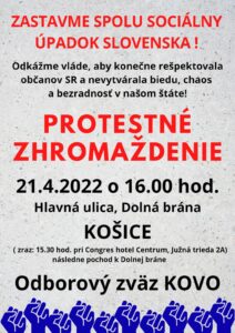 Vo štvrtok, 21.apríla, so začiatkom o 16.00 hod. pred Congres hotel Centrom na Južnej trieda 2A a následným krátkym pochodom k Dolnej bráne, začína v Košiciach verejné protestné zhromaždenie, organizované OZ KOVO, KOZ SR, Jednotou dôchodcov na Slovensku a Asociáciou slovenských kúpeľov.