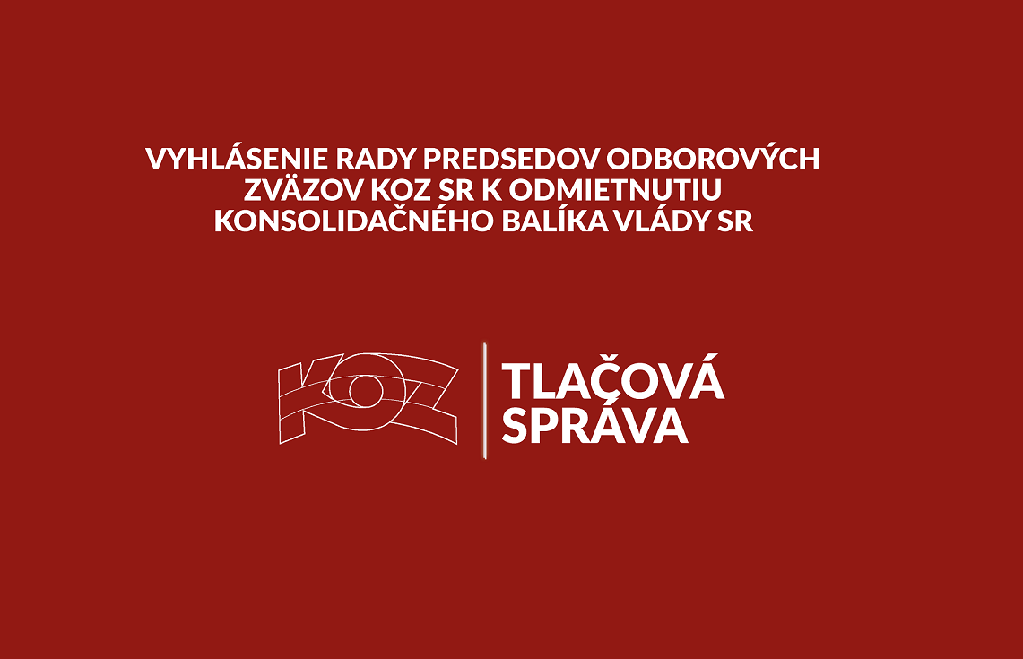 Rada predsedov odborových zväzov KOZ SR vyjadruje svoje zásadné odmietnutie schváleného konsolidačného balíčka vlády SR, rovnako ako urobila KOZ SR už na rokovaní Hospodárskej a sociálnej rady SR, ktorý v súčasnej podobe prináša výrazné riziká pre širokú vrstvu obyvateľov, najmä tých najzraniteľnejších – pre domácnosti a zamestnancov.