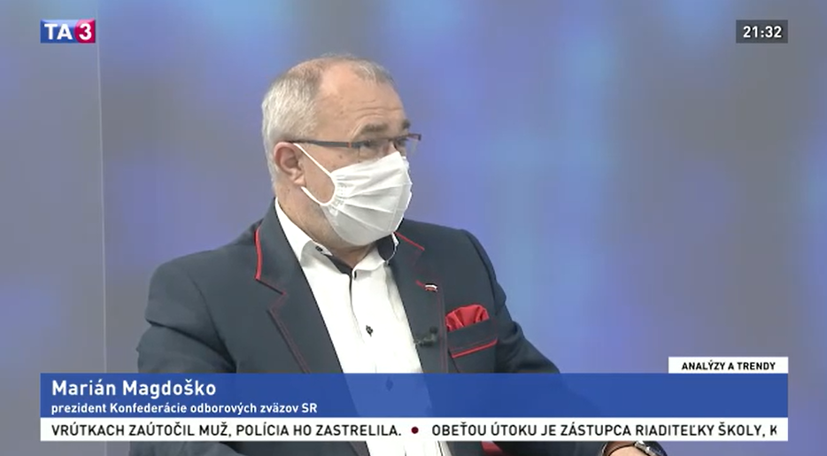 V štúdiu televízie TA3 v relácii Analýzy a trendy (11.6.2020) diskutovali prezident KOZ SR Marián Magdoško a hlavný ekonóm Národnej banky Slovenska o tom, či slovenskú ekonomiku čaká v tomto roku strmý pád a následné zotavovanie bude pomalšie, ako odborníci pôvodne čakali, či bude mať tento vývoj zásadný vplyv na nezamestnanosť, platy zamestnancov, ale aj na ďalšie pracovné podmienky.
