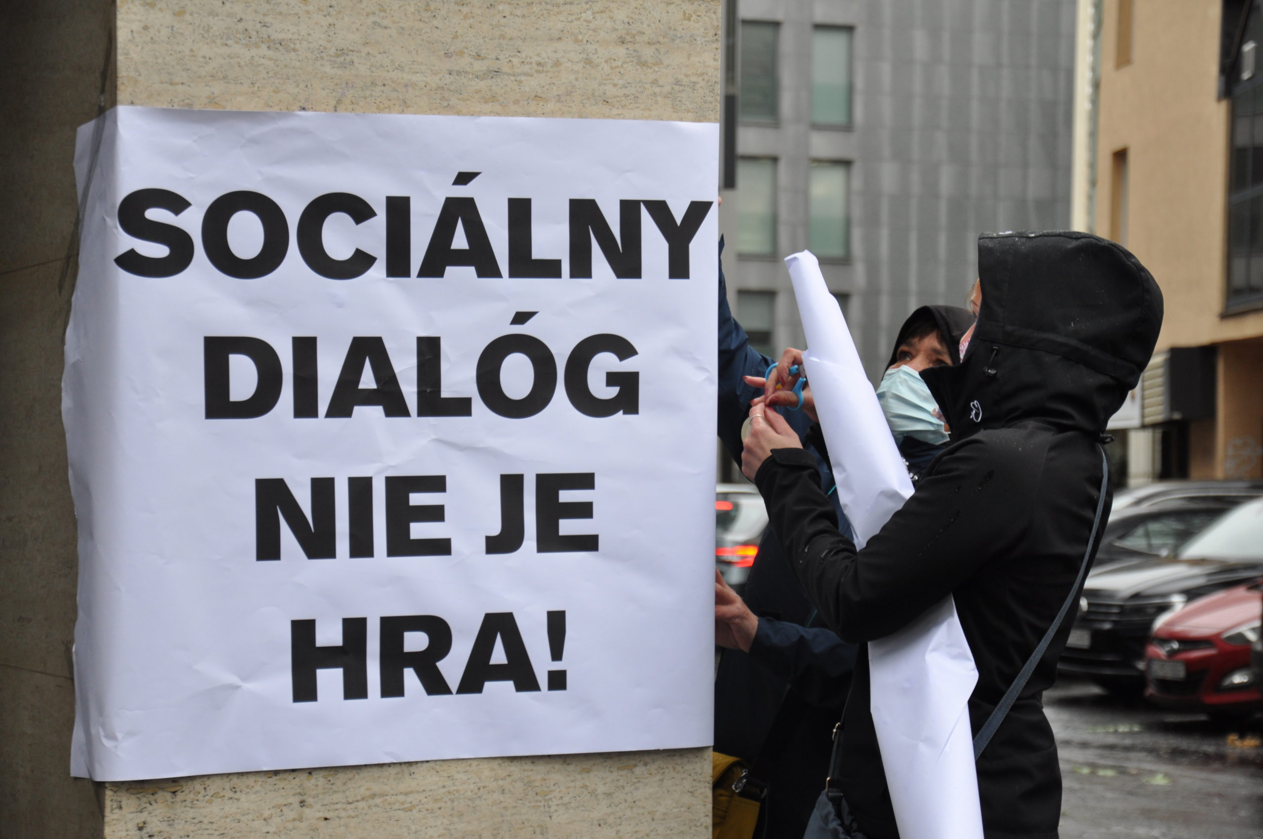 V nadväznosti na už konané „Protestné pochody za práva všetkých zamestnancov“ v 6 mestách Slovenska minulý mesiac pokračovali dnes odborári združení v KOZ SR pred ministerstvom práce, sociálnych vecí a rodiny v protestných aktivitách proti porušovaniu zákonov a predkladaniu noviel legislatívnych noriem poškodzujúcich zamestnancov a za férový sociálny dialóg. Plagáty s nápisom „Minister Krajniak – hrobár tripartity“, „Zákonník práce si zobrať nedáme!“, či „Pracovať a nebáť sa“ vešali skupinky 3-6 ľudí, aby dodržali všetky platné obmedzenia.